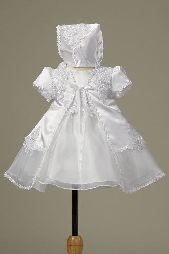 - This Princess Dress is Breathtaking & Beautiful... So Gorgeous it will bring tears to your eyes...Guaranteed! It is perfect for a Baptism Christening Gown, Easter Dress, a Special Dress for her birthday Party or Heavenly keepsake pictures. The bodice of dress is made of high quality shiny satin fabric and organza skirts. Cap sleeve is trimmed with floral laces. Waistline is embelished with laces and pearls. Petticoat has attached crinoline netting for additional fullness. Button closure on back of bodice and sash ties in the back for a perfect fit. Additional gown is constructed of same shiny satin w/ organza fabric and trimmed with laces. It is alsoembelished with bead and lace work on both side of the gown. Comes with matching bonnet that is again embelished with matching bead and lace work. Absolutely gorgeous.