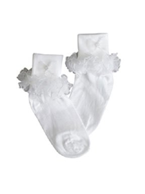 Adorable little girls 100% nylon ruffled dress socks have full pretty organza ruffles at ankle and sweet ribbon bows on sides. A perfect compliment to any little girl's accessories!