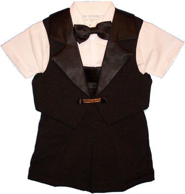 4 piece Infants & Toddlers Short Pants Tuxedo with formal cuffed shorts, attached cummerbund and suspenders. Vest has satin lapels, with satin buttons, and gold chain accent for easy fit and style. Short sleeve white dress shirt. Matching satin black bow tie.