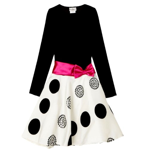 - BLACK & IVORY SEQUINED FLOCKED DOT DRESS features comfortable BLACK STRETCH VELVET BODICE with long sleeves and round neckline plus FUCHSIA-PINK SATIN BAND & SIDE BOW TRIM at the DROP WAIST.
