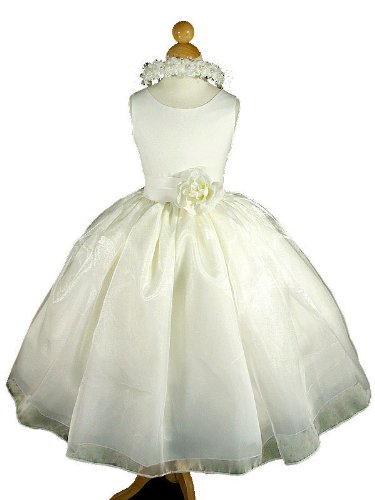 THE MATCHING HAIR WREATH IS ALSO INCLUDED WITH YOUR PURCHASE! This Princess Dress is perfect for a Wedding as a Flower Girl Dress, Pageant Holiday Dress, Easter Dress, A Concert if your child gives musical recitals or Heavenly Keepsake pictures. This elegant bodice is made out of ivory satin. There is a satin band with removable flower on the waistline to make this dress more beautiful. The skirt has 3 layers, the inside layer is satin attached with a netting for additional fullness; the middle layer is soft satin; and the outside layer is made out of organza. The back of the dress has a hidden zipper (not buttons) and a tie sash for a perfect fit at the waist. Absolutely Gorgeous!