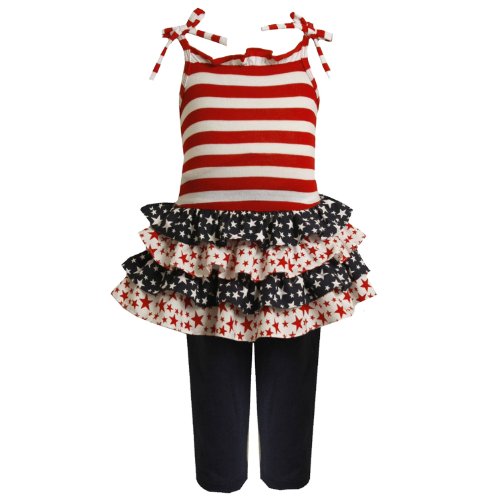 - RED, WHITE & BLUE Patriotic Americana dress/top & legging/pants outfit set features sleeveless dress/top with RED & WHITE STRIPED KNIT BODICE and MULTI TIERED STARS-PRINT SKIRT plus BOW TRIM on the shoulders.