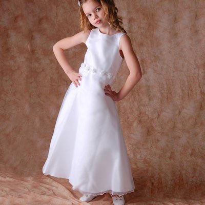 Young ladies look radiant in this pure white Flower Girl party dress. This beautiful dresses features a satin tank bodice with an organza full princess skirt. Embellished floral waist, built in underskirt, zip back closure. Floor length.