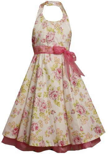 - PINK MULTI GLITTER FLORAL PRINT HALTER DRESS features sleeveless bodice with RUFFLE TRIM at the neckline and PINK ORGANZA BOW TRIM at the waist plus button closure behind neck and elasticized band in back for comfortable fit.