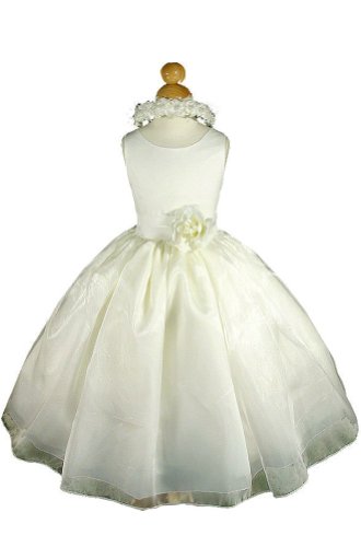 THE MATCHING HAIR WREATH IS ALSO INCLUDED WITH YOUR PURCHASE! This Princess Dress is perfect for a Wedding as a Flower Girl Dress, Pageant Holiday Dress, Easter Dress, A Concert if your child gives musical recitals or Heavenly Keepsake pictures. This elegant bodice is made out of ivory satin. There is a satin band with removable flower on the waistline to make this dress more beautiful. The skirt has 3 layers, the inside layer is satin attached with a netting for additional fullness; the middle layer is soft satin; and the outside layer is made out of organza. The back of the dress has a hidden zipper (not buttons) and a tie sash for a perfect fit at the waist. Absolutely Gorgeous!
