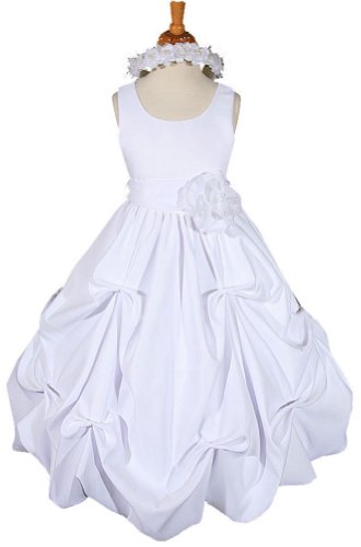 THE MATCHING HAIR WREATH IS ALSO INCLUDED WITH YOUR PURCHASE! This Princess Dress is perfect for a Communion Dress, Flower Girl Wedding Dress, Pageant Holiday Dress, Easter Dress, and a Special Dress for her birthday Party or Heavenly keepsake pictures. The entire dress is made out of high quality white satin. The waistline has a removable satin sash with flower to make this dress more elegant. The skirt has two layers, the inside layer is satin attached with a netting for additional fullness, the top layer is actually a double layer, and the outside layer is made out of satin that create the pick up, puffy effect. The back of the dress has a hidden zipper and a removable tie sash for a perfect fit at the waist. Absolutely gorgeous!