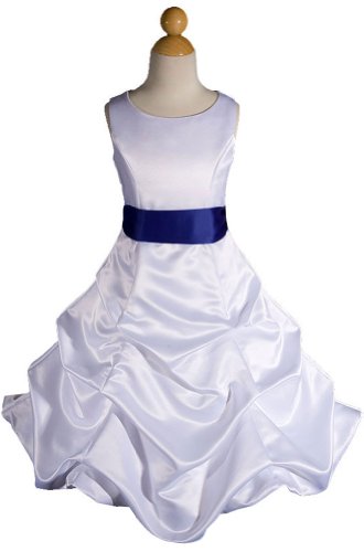 This Princess Dress is perfect for a Wedding as a Flower Girl Dress, Pageant Holiday Dress, Easter Dress, Recital, Formal Event, and a Special Dress for her birthday Party or Heavenly keepsake pictures. The entire dress is made out of high quality white satin. The waistline has a removable royal blue satin sash to make this dress more elegant. The skirt has two layers, the inside layer is satin attached with a netting for additional fullness, and the outside layer is made out of satin that create the pick up, puffy effect. The back of the dress has a hidden zipper and a removable tie sash for a perfect fit at the waist. Absolutely gorgeous!