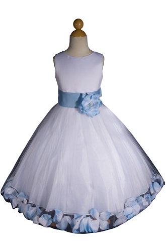 This Princess Dress is perfect for a Wedding as a Flower Girl Dress, Pageant Holiday Dress, Easter Dress, and a Special Dress for her birthday Party or Heavenly keepsake pictures. This elegant bodice is made out of white satin. There is a removable sky blue satin sash with a flower on the waistline to make this dress more beautiful. The skirt has 4 layers, the inside layer is satin attached with a netting for additional fullness, the middle layer is soft satin, and the outside layer is actually a double layer of fluffy tulles with sky blue rose petals in the bottom of the dress. The back of the dress has a hidden zipper and a tie sash for a perfect fit at the waist. Absolutely Gorgeous!