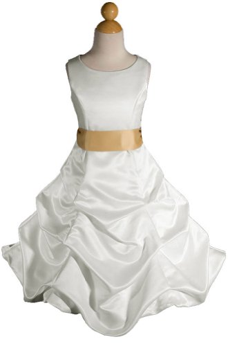 This Princess Dress is perfect for a Wedding as a Flower Girl Dress, Pageant Holiday Dress, Easter Dress, Recital, Formal Event, and a Special Dress for her birthday Party or Heavenly keepsake pictures. The entire dress is made out of high quality ivory satin. The waistline has a gold satin sash to make this dress more elegant. The skirt has two layers, the inside layer is satin attached with a netting for additional fullness, and the outside layer is made out of satin that create the pick up, puffy effect. The back of the dress has a hidden zipper and a removable tie sash for a perfect fit at the waist. Absolutely gorgeous!
